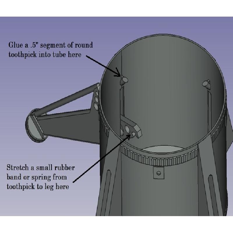 This 3D-printable reproduction has the advantage of allowing easy replacement of the springs/rubber bands used on the landing gear - something that was difficult to do on the original. Most parts connect via twist-lock fittings. Only the landing pads (feet) need to be super-glued together and glued onto the landing gear (legs). The landing gear shown are red PLA and everything else is white PLA, with the pads spray-painted silver.