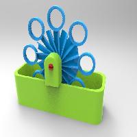 the wind drives the fan which has the bubble wand attached as one piece. the low box wall is to allow more wind to hit the fan/wand.