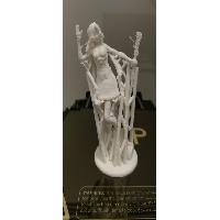 for scale, the model is ~121mm tall including base. i would strongly recommend not printing this any smaller, there are already very small and fragile features as it is.