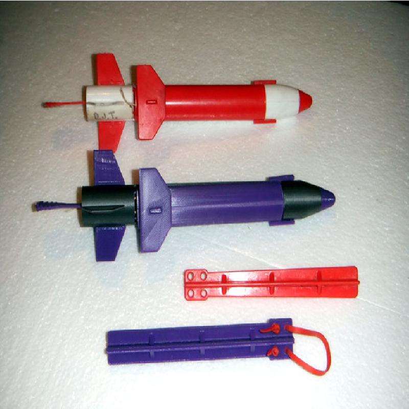You can, of course, print your rocket in whatever color scheme you like, but the original was molded in red and white, as shown in the illustrations. The completed rocket is 245mm tall, including the grip. The main body itself is 195mm tall. What with the additions I've added to my Tevo Tarantula, I only have 170mm available on the Z axis. For this reason, I have provided two versions of the main rocket body. I highly suggest that you use the _1piece model if at all possible. If, like me, though, you can't, you can print the _upper and _lower halves and glue them together.
