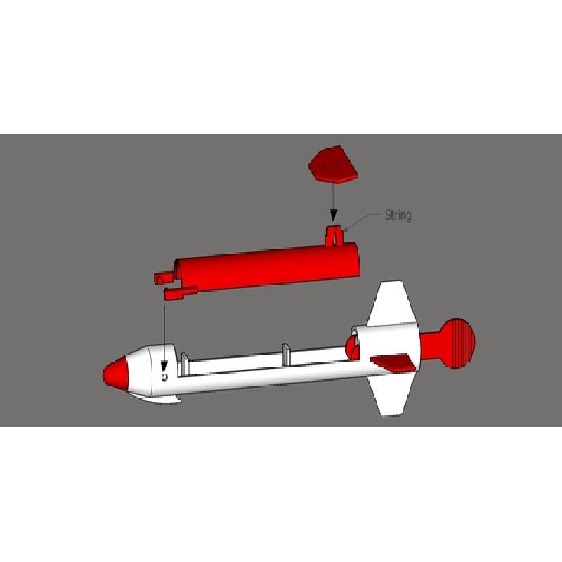 11. Press the ejector / parachute down into the rocket and close the bay door. Take the string that you tied around the mount earlier and bring it back past the top tail fin. For storage, to keep the bay door closed, simply wrap the string around the grip and tie it off.