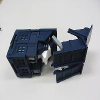 This design is scaled to two-thirds the size of the original. It takes about one-third the plastic to print. It has about half as many parts, and is easier to assemble. The transformation sequence is simpler. Thanks to some interlocking tabs, the toy holds together very firmly both in robot mode and in Tardis mode. Due to the reduced weight and the redesigned joints, the robot easily stands on its own unsupported.