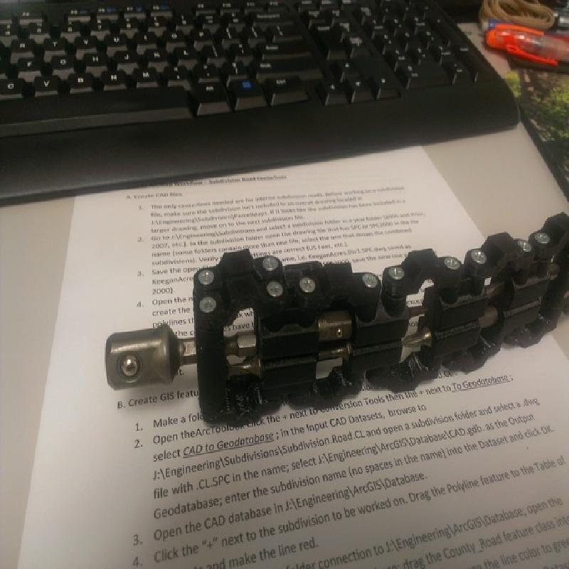 Designed in a few hours to be similar to the new Leatherman Tread tool bracelet, but not to cost their $150-200 MSRP. You supply the hex bits. i saw the article on Engadget.com yesterday (january 22nd 2015) about the new Leatherman Tread. I read the back story and knew i had had a similar experience (identical, really) so i decided to make something similar for me, that would fall far short of their $150-200 MSRP. I took a few hours to design and produce it. it works for me. If you would like to suggest mods, or better yet, post mods you've done, by all means, go ahead. i made a link that fits two normal 1/4" hex bits, a link that holds a 1/8" and a 1/4" bit, and a link that holds two 1/8" hex bits (because i have a few of those too). plus i made a link that can work as a changeable hex-driver.