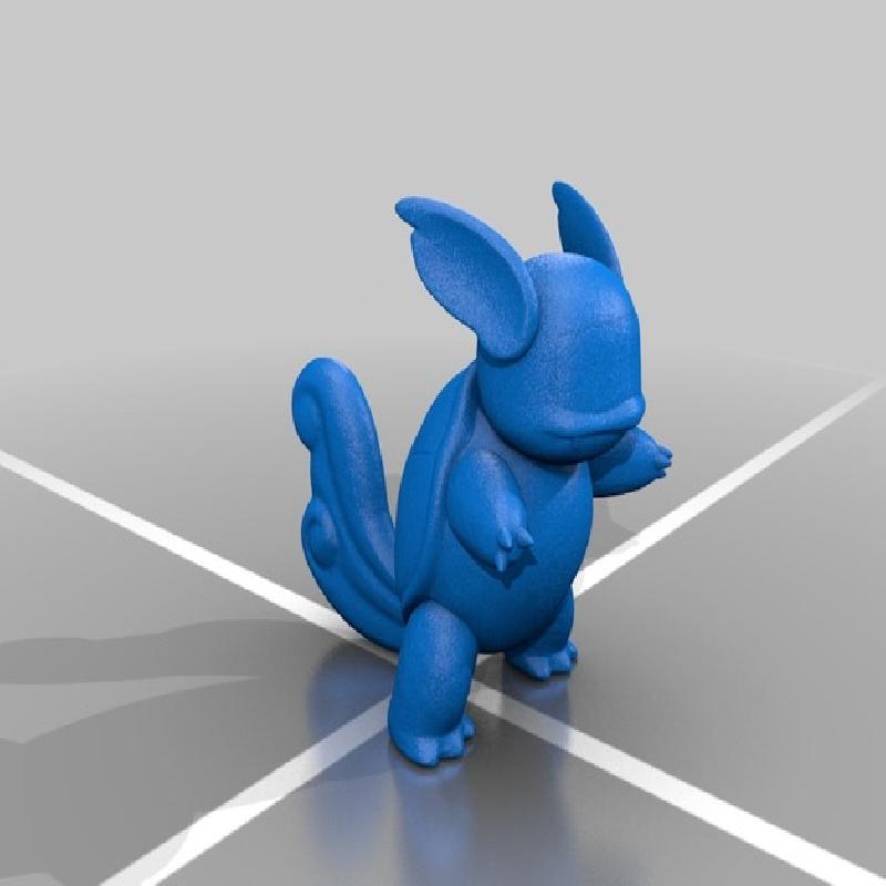 Wartortle is a bipedal, indigo Pokémon similar to a turtle. It has brown eyes, a dark blue streak on each cheek, and two sharp teeth protruding from its upper jaw. It has three clawed fingers and pointed toes. Pale blue fur covers its long ears and tail. A brown shell with a pale yellow underside encases its body. A thick, white rim separates the upper and lower halves of the shell. As Wartortle grows old, its tail fur will darken, and it may have algae growing on its shell. The shell may also carry scars from past battles.