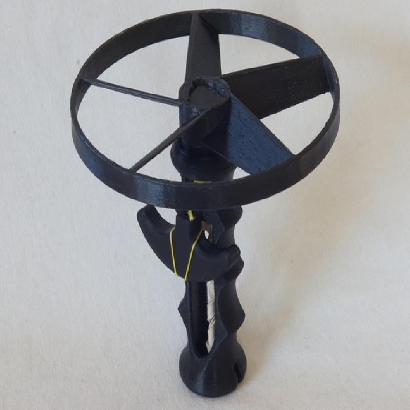 Print all parts and the propeller with the number of desired blades (at this time I have only tried the 5 blade). I printed in ABS using 3 perimeters, 0.2 mm layer height, 25% fill and a 1 cm brim to help hold the tall parts on the print bed. The narrow part of the spool was printed solid. No support was needed if printed in the given orientation. You know your setup best so adjust accordingly.