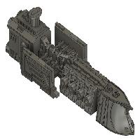 Suitable in size and armament for a stand in for the Voss-pattern class light cruisers for the defunct tabletop wargame Battlefleet Gothic. Uses standard imperial weapons batteries.