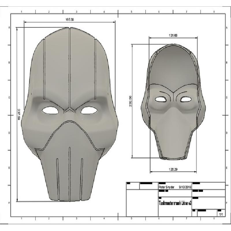This mask is sized to fit an adult male head. Check PDF file for dimensions. Units are in mm.