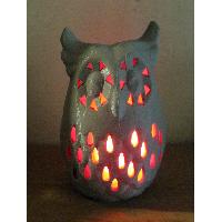 A ceramic candle holder shaped like an owl. It was found in a thrift store and digitized with Autodesk's ReCap Photo. The digitized image was hollowed and eye holes and tear drop shaped holes created with openSCAD. The stl file is at full scale.