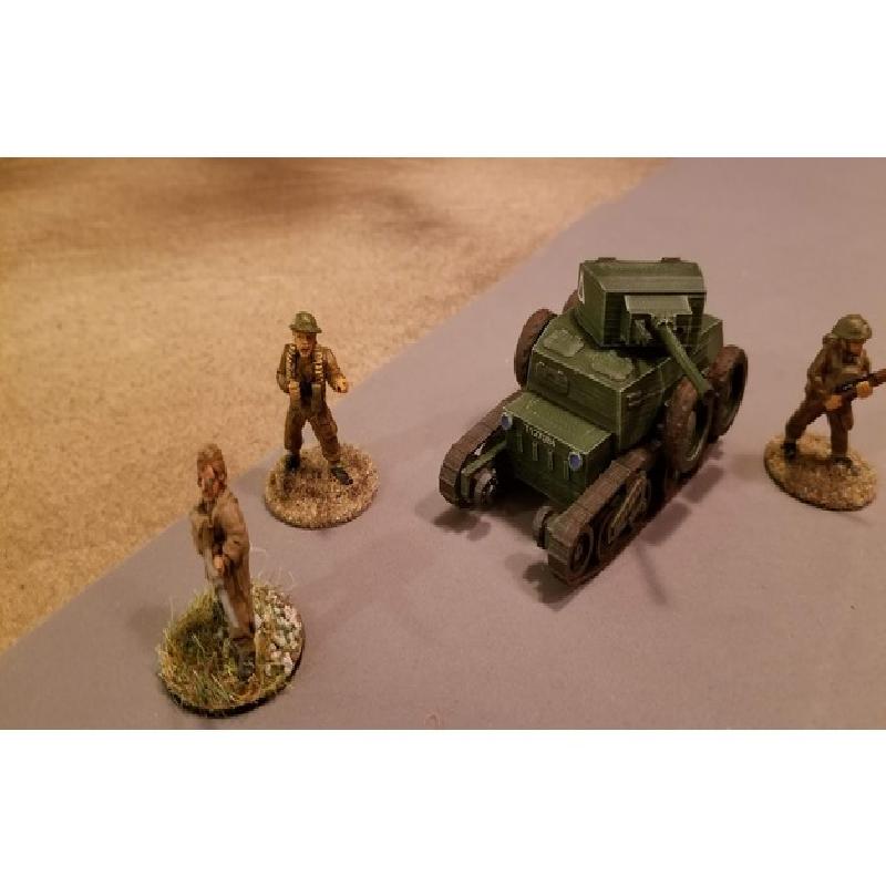 It was armed with a 2 pounder ATG and a coax medium MG. Its armour would count at a +7 in the Bolt Action Vehicle Design System, and would run at 105 points for a regular crew vehicle - 50 points for +7 armoured vehicle, 50 points for light ATG and 5 points for coax MMG.