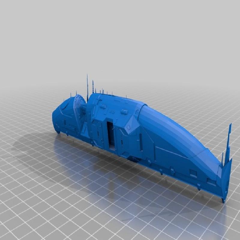 This is the Kushan Mothership from Homeworld. It comes in two versions: One with the large cargo bay door filled and closed, and another open with the door separate.
