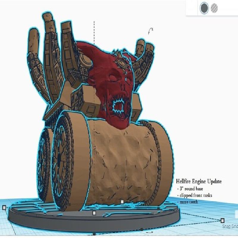 Was asked to create a 3D printable "Hellfire Engine" for 5th ed. Dungeons & Dragons. So here it is! First version has a 2"x3" base. Updated version has a 3" round base, clipped front tusks so that the face is less obscured, and a 360 degree set of teeth.