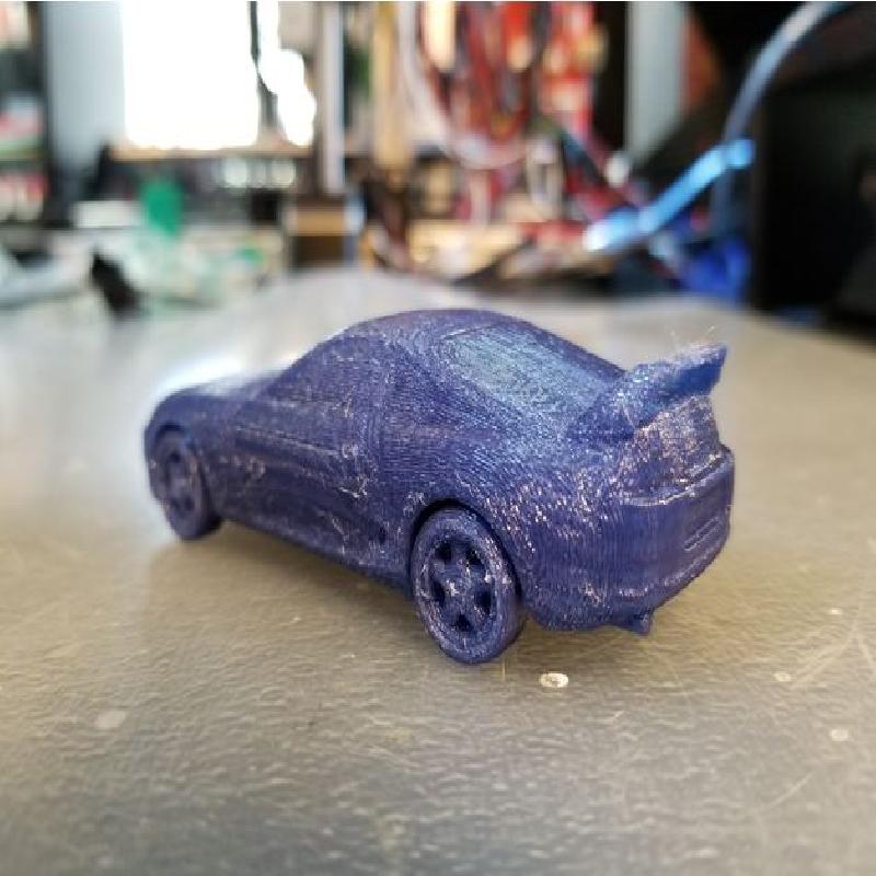 I remixed the Supra model to print on its side with the wheels and axles built in. Print as oriented, no supports, if slic3r doesn't import it correctly use Cura.
