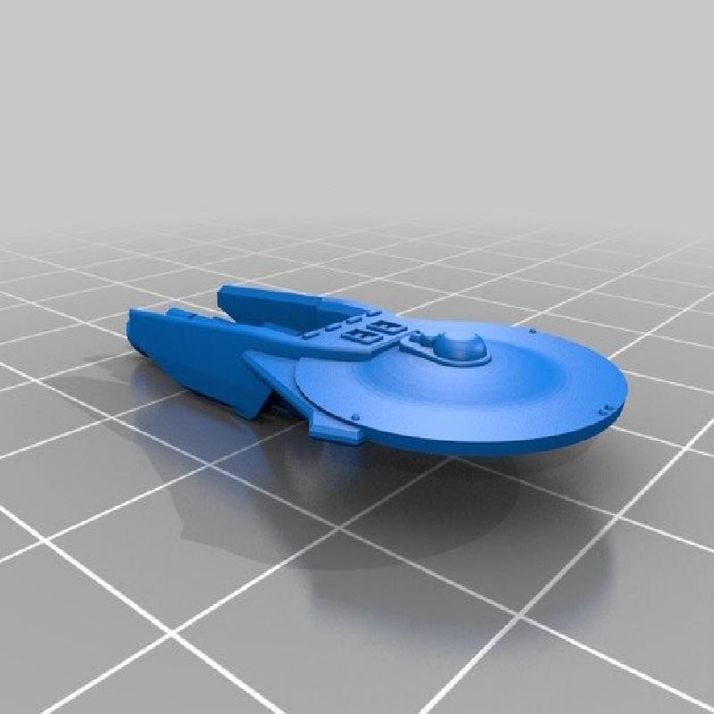 A variation of the FASA Federation Thufir destroyer in 1/7000 scale. No mounting hole provided; suggested contact point for mounting is the bottom rear of the saucer section.