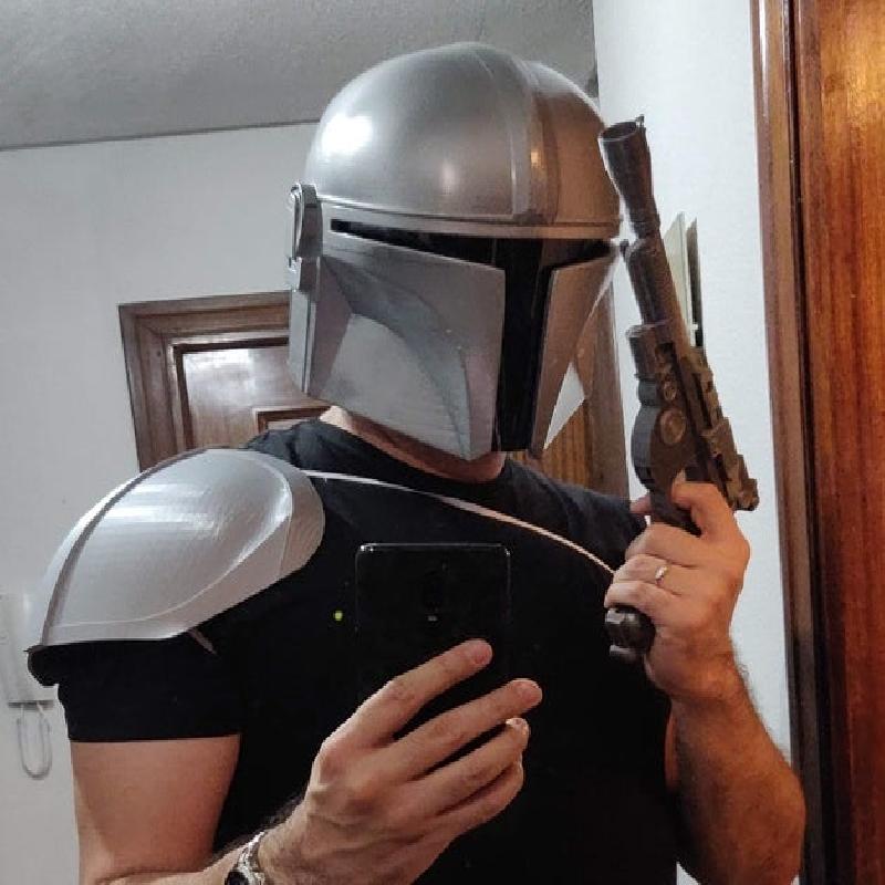 The Mandalorian beskar armor right shoulder. Modeled from scratch based on series pics. Use two glued elastic bands to secure it in place, the lower one around the arm and the upper one around the chest.