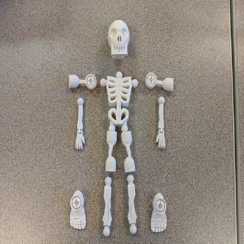 Posable skeleton figure with ball joint connectors. Hands include print-in-place hinges.