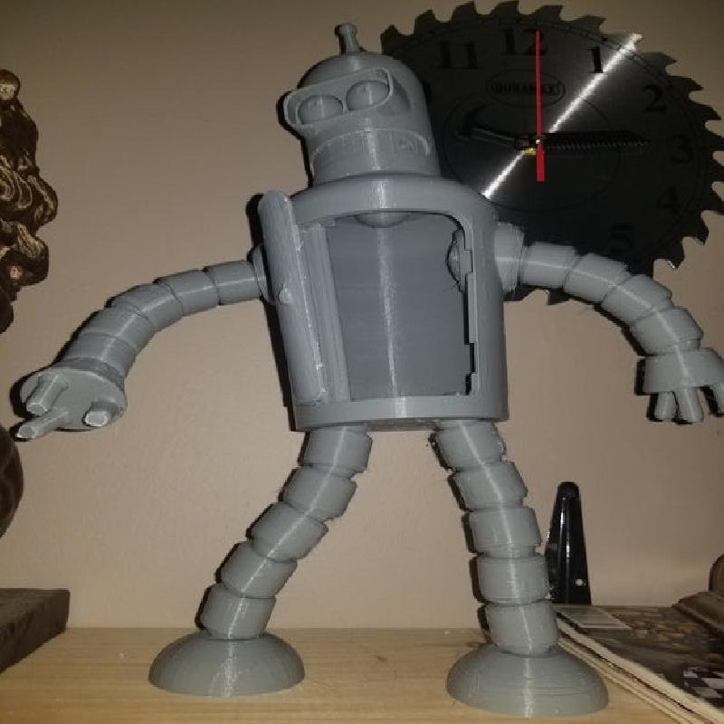 Bender from Futurama - Pose-able. Print the quantity of each STL as the file name states. Some model file may require supports such as the head and the door. All parts have some mobility.  Total assembled height is somewhere around 430mm/134". sample that was printed in the photos is from a poorly calibrated X5S and was done for the purpose of tweaking the model.