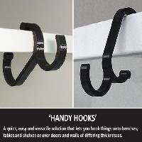 'Handy Hooks' do not need to be fixed with screws or adhesives. They simply hook onto walls, doors, shelves, chairs etc. and the one type / size will work over a range of thicknesses making them a very versatile system. Refer to the images for additional explanation.