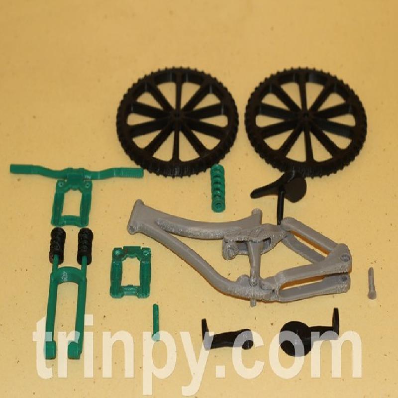 This is a miniature downhill mountain bike with working front and rear suspension, wheels and cranks. The frame is all printed in one piece and then the other parts snap fit together. The front suspension is quite tricky because it is so small. While this is a working model remember that this is plastic so it is not very strong.