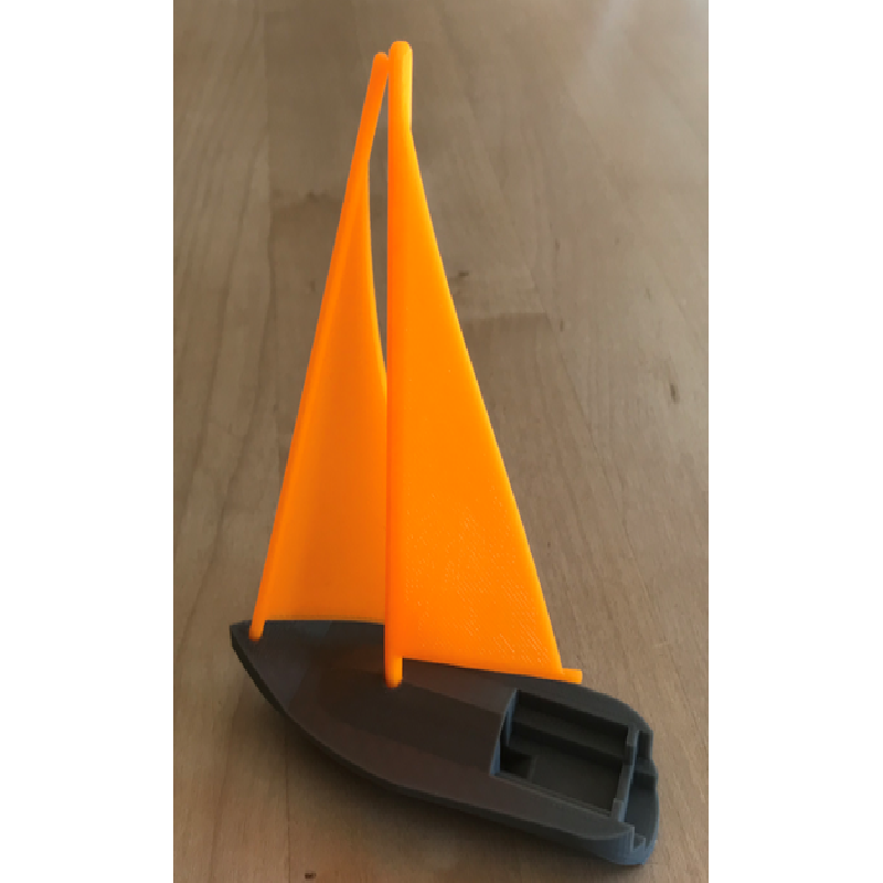 beide Segel liegend drucken, auf der flachen Seite, kein Raft, keine Supports. Das Focksegel direkt nach dem Druck über den Mast von der warmen Base abziehen, dadurch wird es gerundet.