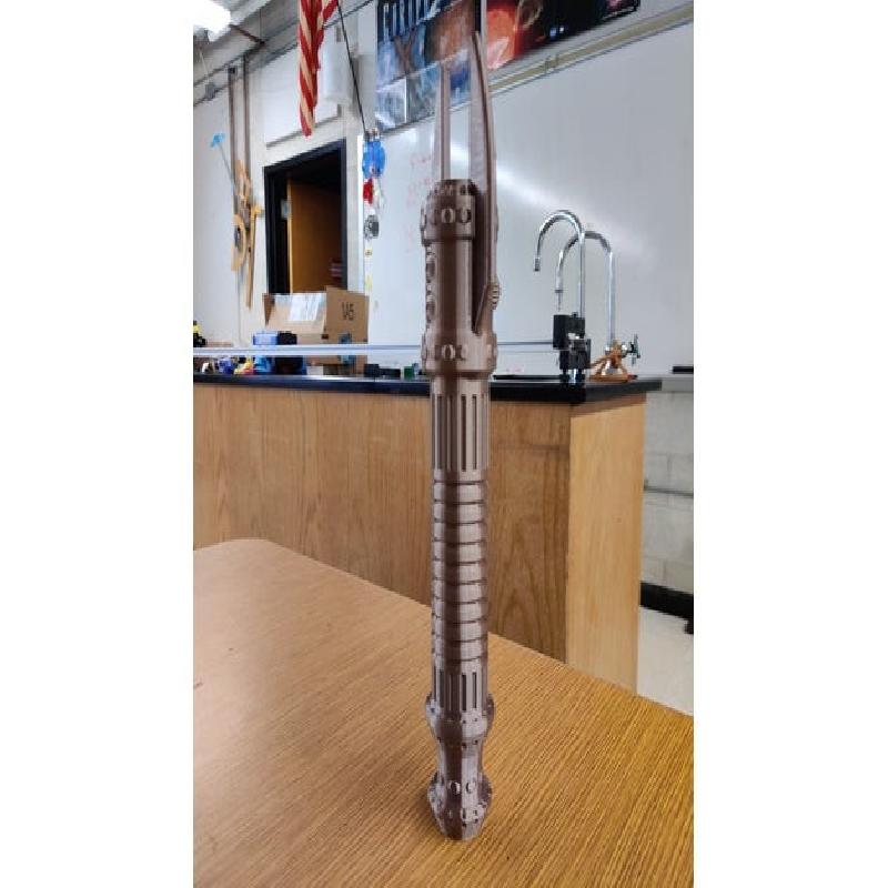 The design is rather simple. To begin, I made the basic shape (no side blades, holes, buttons, or grooves) of the lightsaber on a sketch and then revolved it. I pre-filleted my sketch so I didn't have to fillet when it is extruded. Then, on the front plane, draw the side daggers and extrude them out .2 inches. Follow by chamfering the edges. Then, cut out groves by sketching a rectangle and revolve, cutting them. Then, chamfer the insides, creating a cool pattern and a good grip once printed. Follow by creating a horizontal cut at the top and bottom using a 1,10 by .6 inch rectangle and cut it down by .75 mm. Then circular pattern this 16 times around the saber. make a hole, then circular pattern it 16 times excluding the ones that overlap with the daggers, do the same thing with the bottom, but, make it go all the way through to the top. Chamfer the top of the saber. Using the front plane, make two circles under the top bulges, and extrude them up .1 inch off the surface, chamfer them, then circular pattern them around 16 times, do the same thing for the gap in the bottom, but pattern them only 8 times. To make the buttons, cut out 2 holes on one side and fill them with the dome feature. Then use the hexagon sketch and cut it out for aesthetics. one the other side, cut out a larger circle. Make a cylinder inside this shape with an offset of 2 mm. Then, proceed to make a 4 mm wide circle with its center on the edge of the cylinder. circular pattern the small circle around the large circle as many times as you can without overlap. Cut extrude these holes to the bottom of the hole. Then, chamfer it. It will look like a dial at the end.