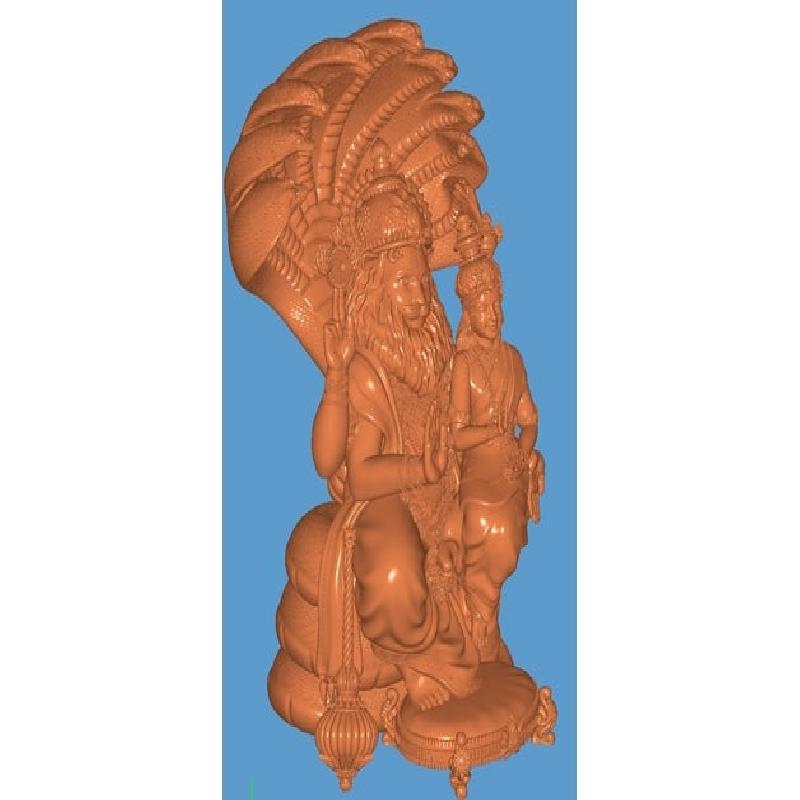The part man, part lion Hindu god - Narasimha is sitting on the coil of a giant multi-headed snake called Sesha. The heads of the snake acts as the hood above his head. His consort goddess Lakshmi is sitting on his lap.