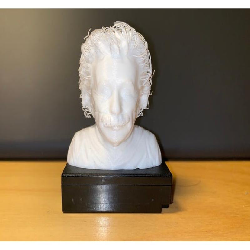 This is a remix from LSMiniatures, inspired by printthatthing, but his thing didn't print so I redid it. The white Hairy Einstein was printed scaled down 50% as a test, but I wouldn't scale it down that much as that makes the hairs and the surrounding support wall too thin and will either not stick while printing or break off easily while cutting. Lost lots of hairs due to that and also while cutting with a knife. I recommend using thin scissors instead. Also lost some of the moustache and all the eyebrows for the same reasons.You will also need to trim the moustache and eyebrows before blowdrying the hairs into position. And a final touch up trim of the back if needed.