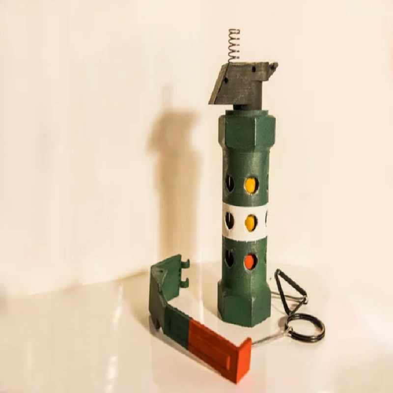 Here is my m84 stun grenade replica. I split up the files so they are easier to print. In my printed copy I used cotter pins and metal rings instead of printing the pins. I also choose to drill the holes for the pins and spring rather then add them to the model. The spring was something I had so I drilled a hole in the head to fit it. The secondary safety pin has no function but the primary pin retains the spool which is under spring tension. For the inner core I used a piece of scrap pvc pipe that I cut to length. Enjoy