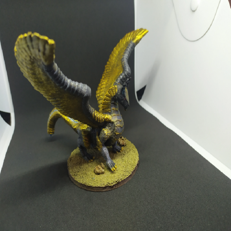 The model is split in three, the two wings and the body. I also printed a 76 mm base for him and decorated it afterwards. It is scaled for a 76 mm base, but feel free to scale him up or down.