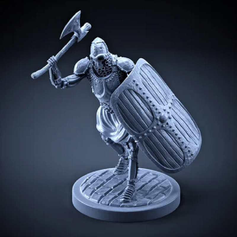 One variation of the Skeleton-themed NPC pack of FREE miniatures. Axe and Square Shield equipment combo, heavy armor with chainmail, metal plate armor and a tunic underneath.