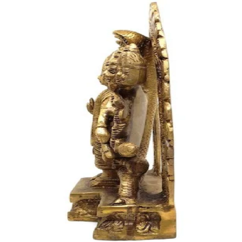 A brass cast of 'Vishvarupa' ("Universal form", "Omni-form").It is an iconographical form and theophany of the Hindu god Vishnu or his avatar Krishna. It is said to be the physical manifestation of the indescribable Supreme Being. Vishvarupa is considered the supreme form of Vishnu, where the whole universe is described as contained in him. Hindu mythology has multiple mentions of this manifestation of Vishnu that has overwhelmed the human senses because of its infinite nature. Seen here with 'Adishesha' (the foremost of snakes) forming a protective umbrella over Vishnu.