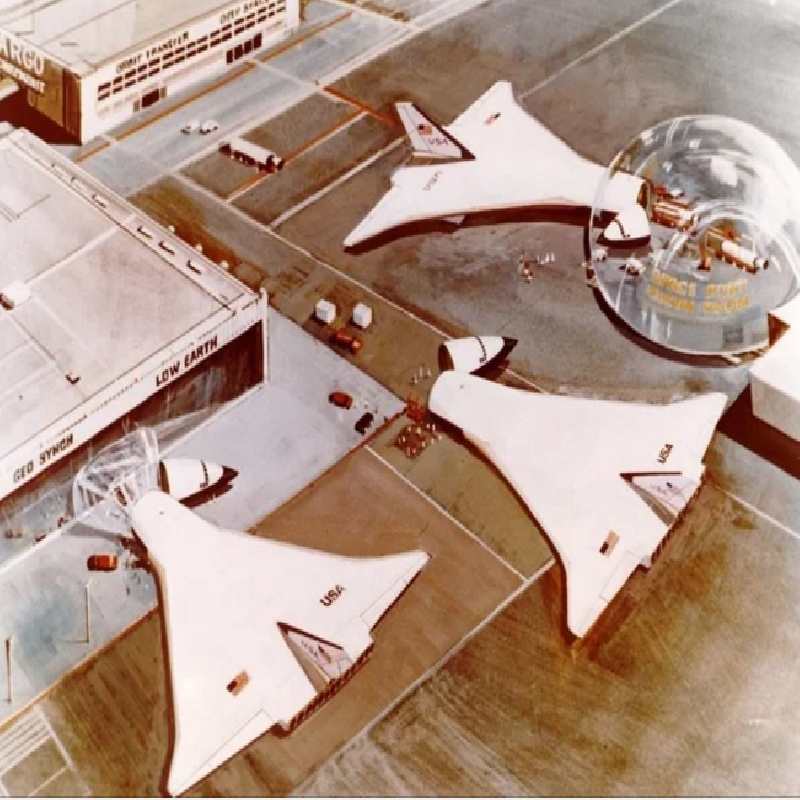 In 1978, NASA and DOE were looking for some cool new thing to build and they had Rockwell (maker of the B1 Bomber) draw up some awesome sketches. Fortunately for tax payers, it was never built. But unfortunately for retro sci-fi nerds, it was never built. Anyway, the idea was a huge delta wing (bigger than a 747) full of fuel(s?) and a fuselage that could be used to store all kinds of.. stuff, a nosecone that opened up like a cargo plane and... did I mention rockets?! Then... somehow... profit.