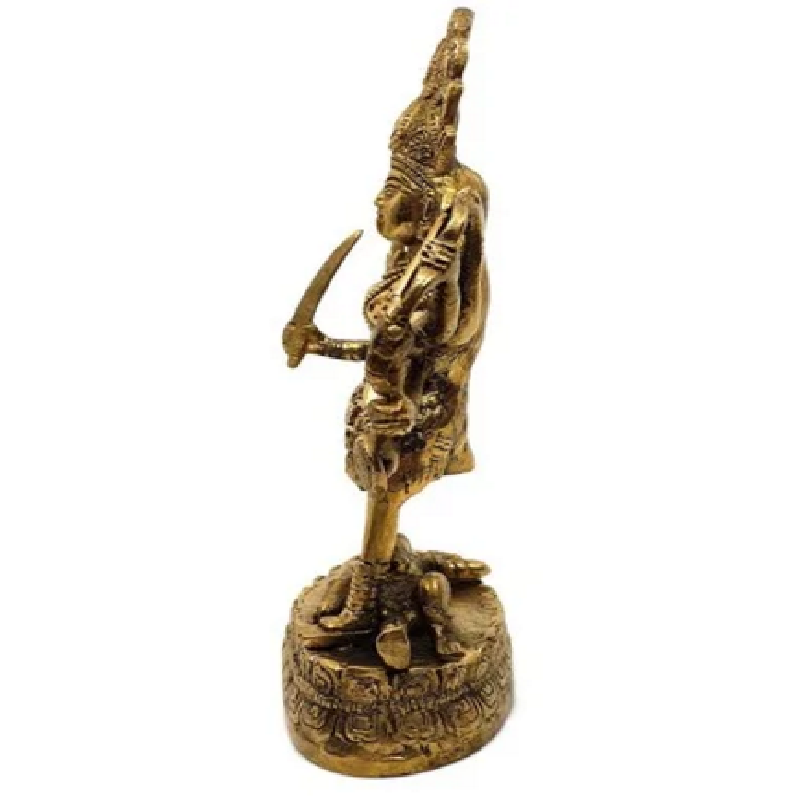 Mahakali, is the much revered Hindu mother goddess of time, death and doomsday. She is described as being black in colour but is most often depicted as blue in popular Indian art. Her eyes are described as red with intoxication and in absolute rage. Her hair is shown disheveled, small fangs sometimes protrude out of her mouth, and her tongue is lolling. She is often shown wearing a skirt made of human arms and a garland of human heads. Each of her ten hands is carrying an implement which varies in different accounts, but each of these represent the power of one of the Devas or Hindu Gods and are often the identifying weapon or ritual item of a given Deva.