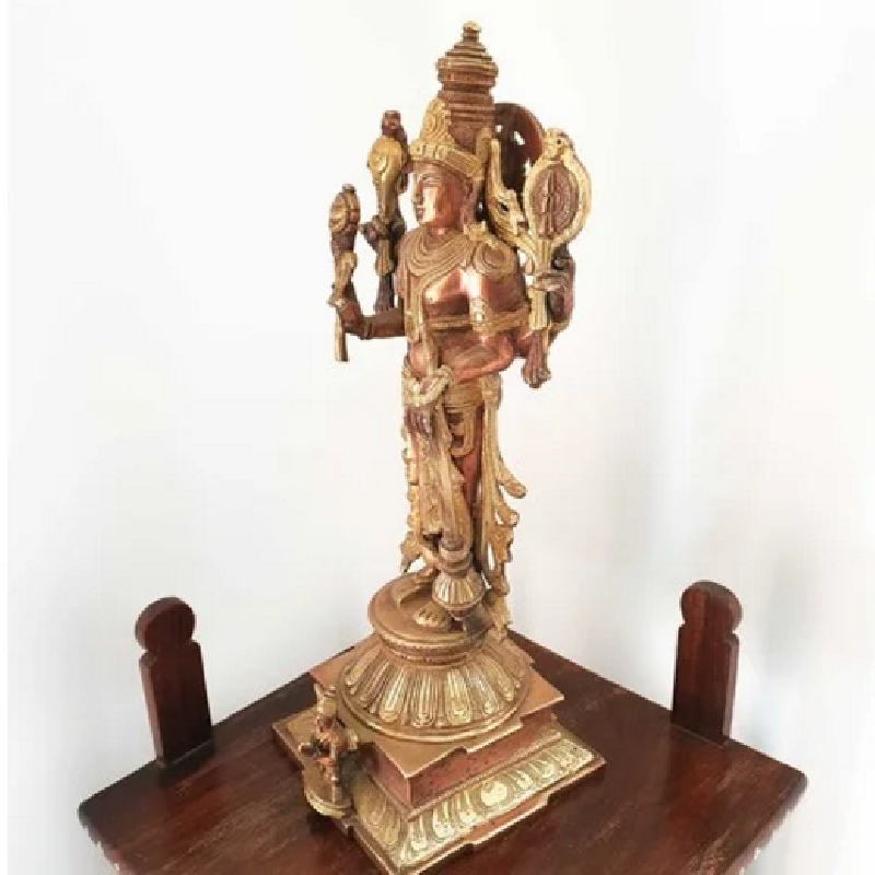 Vishnu is the one of the three principal deities of Hinduism - Brahma the Creator, Vishnu the Preserver and Shiva the destroyer. Vishnu is the god of Preservation, the great maintainer who often appears in various incarnations (avatar) to provide salvation for humanity. His appearances are innumerable; he is often said to have ten avatars—but not always the same ten. Vishnu’s vahana, his vehicle in the world, is the eagle Garuda;Seen here sitting at his feet ready to carry his master through the heavens.