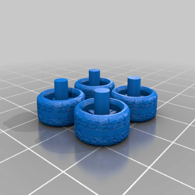 I included 2 sets of tires, one set is trimmed flat for the bottom so that it prints without support, the other set is the higher detail outer rim with angled rim supports to the hub. I imagine they will be a b*tch to print and set, so I put up both sets so you can decide your compromises. You will need to sand the axles to insert into the body, won't take much (or drop the scale a few percent on the wheels on the x,y)