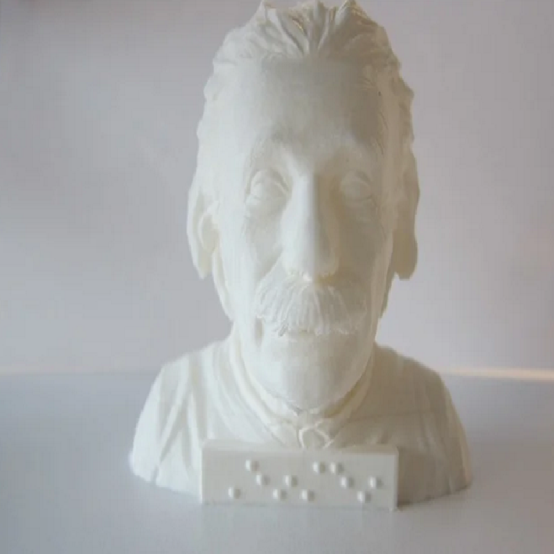Touch readers should be able to recognise the messy hair, moustache and large nose.