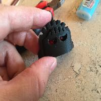 I created mine with light up eyes by placing a few small batteries inside the body under the head and an LED inside of the hollow head. The robot also has a small bucket in the back for paperclips and maybe pens or pencils.