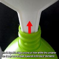 The design features ridges that stop the funnel sealing against the neck of the container liquid is being poured into. This ensures air can always vent as liquid is being poured in without the need to also hold the funnel as you are pouring. This makes transferring liquids easy and minimizes the chance of the funnel overflowing.
