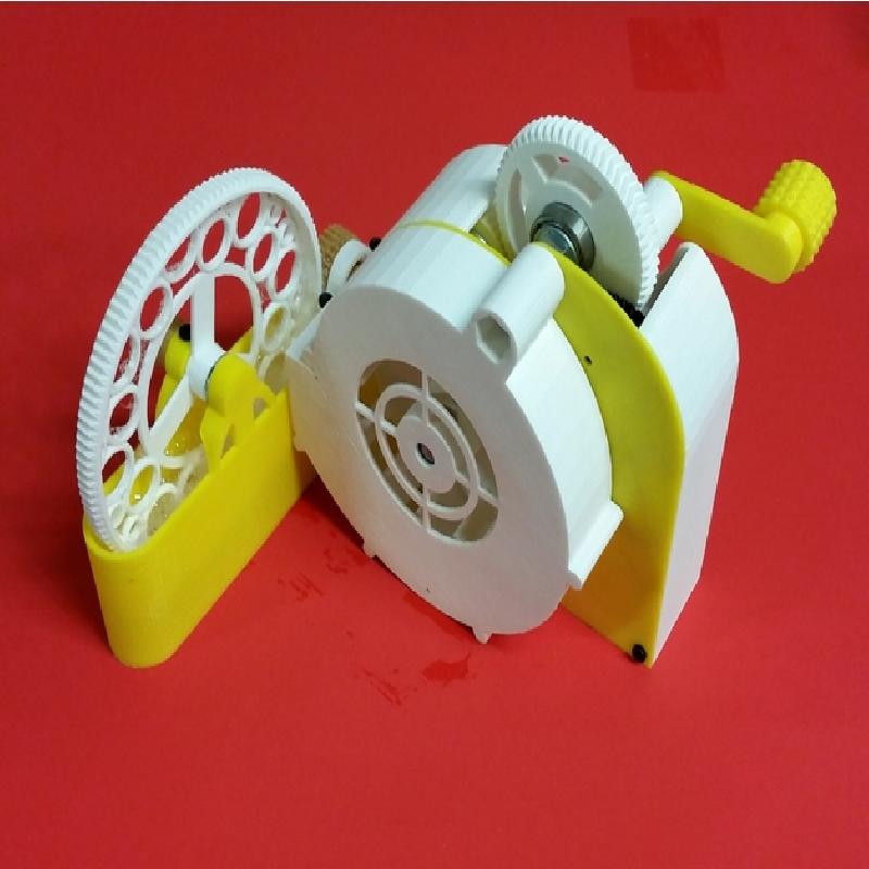 For anyone wanting a simple hand-cranked impeller fan (also known as centrifugal fan), print everything except the Reservoir.stl, Bubble wheel.stl, Gear strap.stl, and Wheel pin.stl. The transmission results in a ~1:9 ratio of input to output.