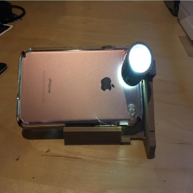 Works with all phones that have a flashlight. The height and distance is adjustable. I printed the models out smaller than usual in the pictures. Works as a stand.