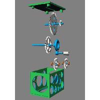 Slide the Smallest Gear and the Blade onto the Blade Shaft and then angle the end with the Small Gear into the Table Bottom into the last hole on the right and slide the other end down into the hole on the left.
