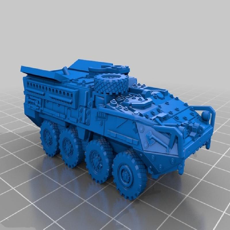 This is a rework of one of m_bergman's outstanding 1:100 series Stryker vehicles. Very simple, prints well.