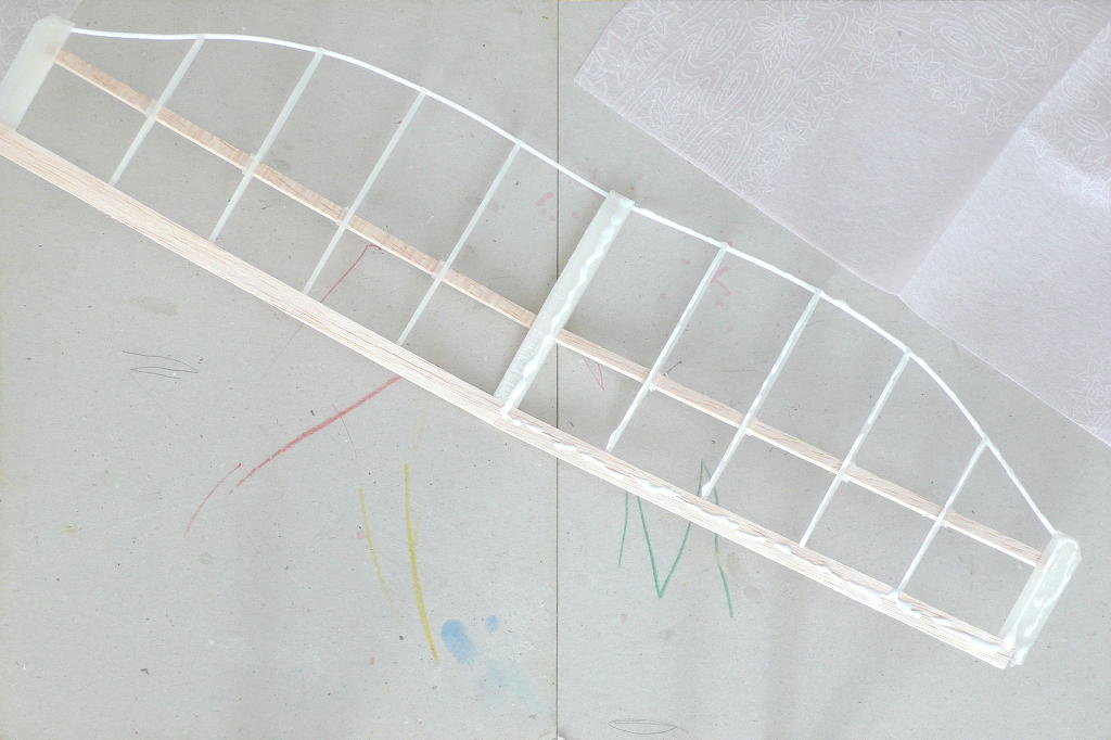 Step 1: Start with the wing body and wing tips and connect them with the two 20,8cm balsa bars