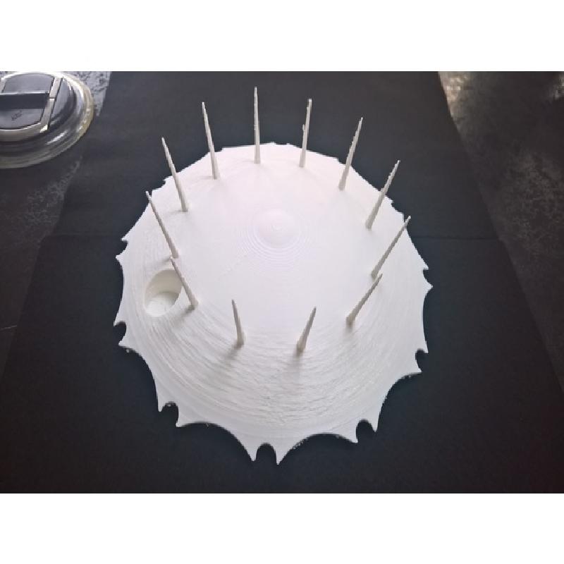 This was a challenge to print due to the shallow dome, I used supports for all areas that had a direct route to the print bed. This caused the texture on the lower dome as it was printing without supports until it reaches the spikes.
